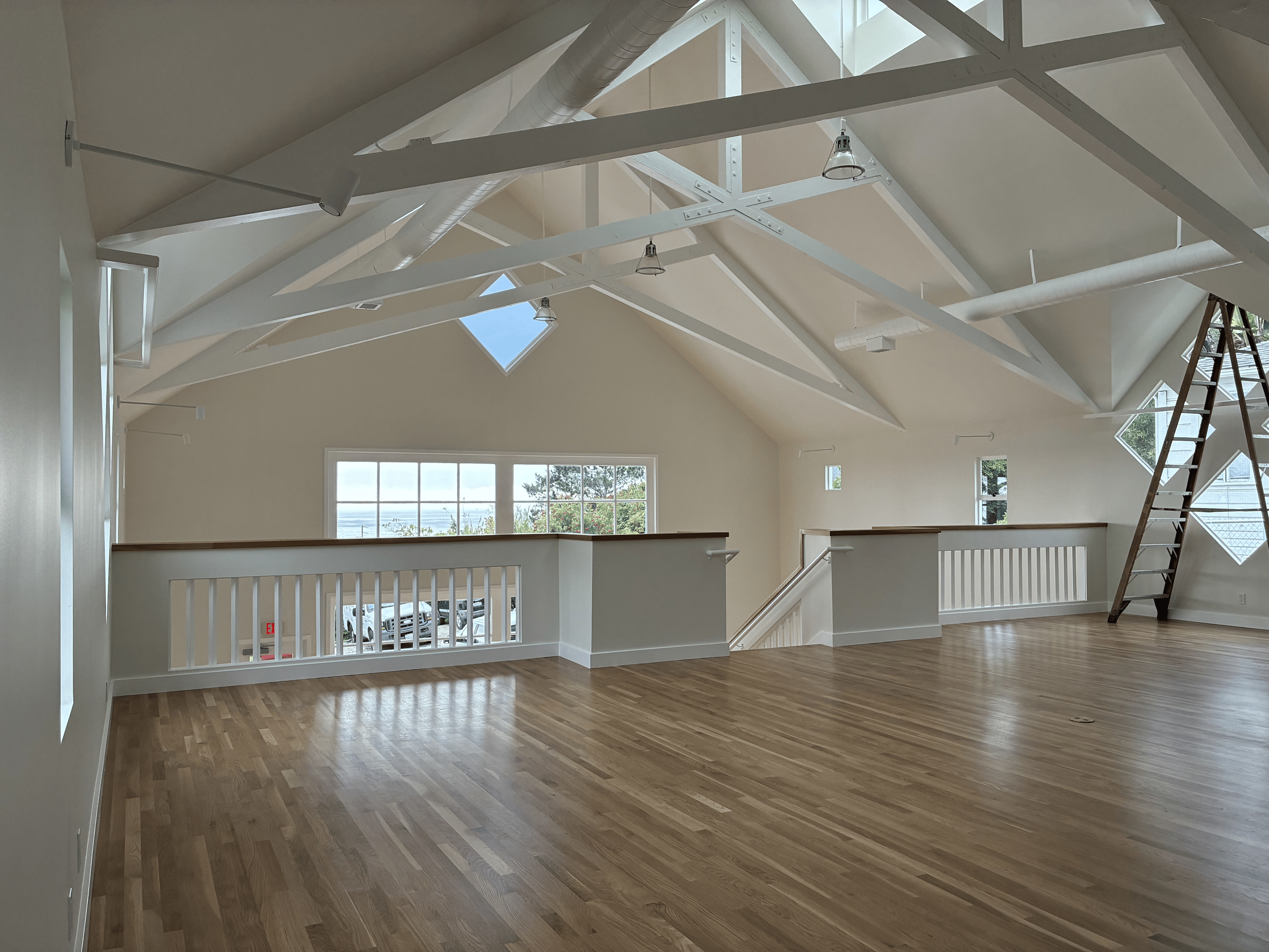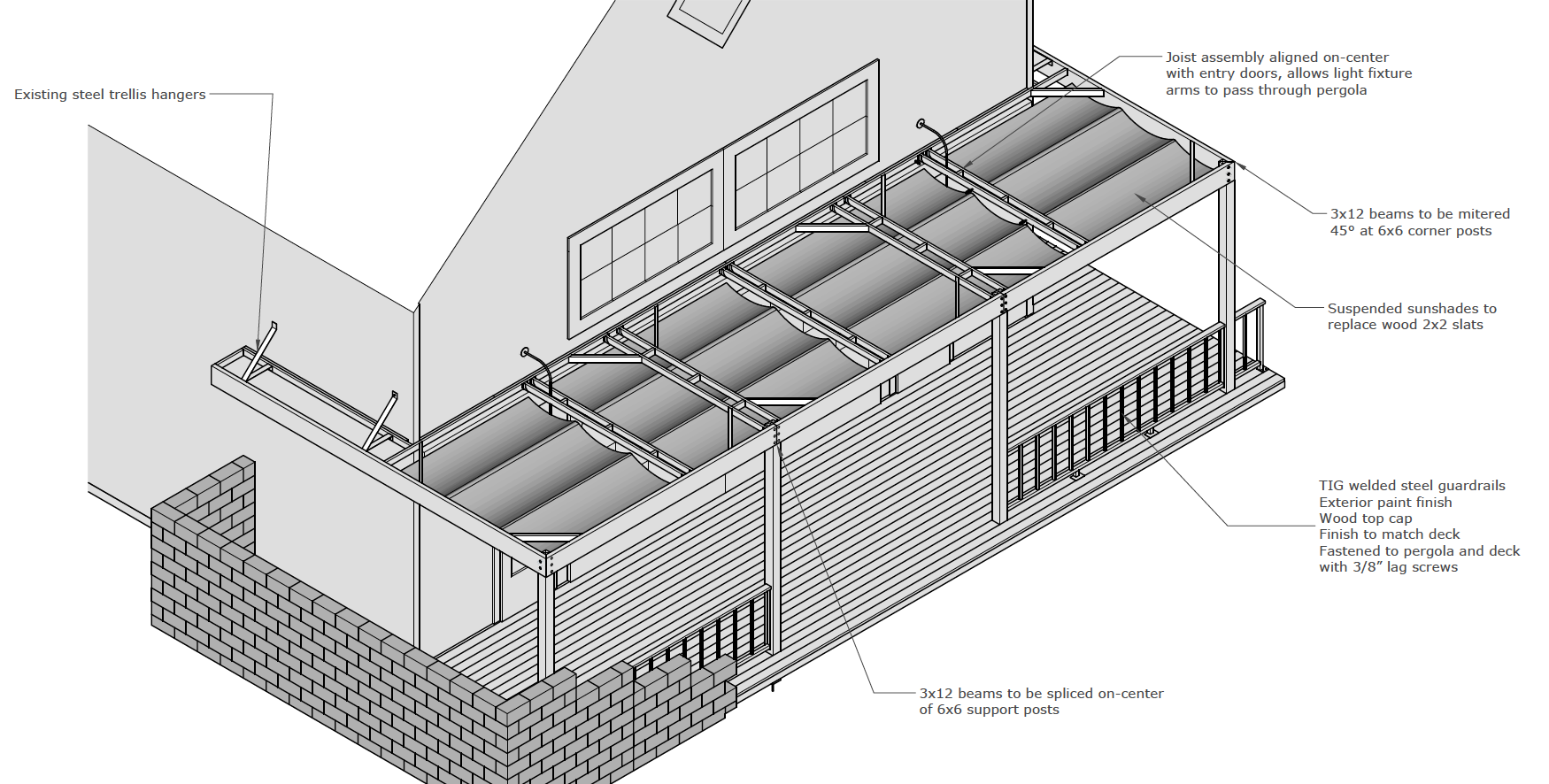 The intent behind the custom pergola was to be a version of the original slatted “eyebrow” that extends to the edge of the entry deck. It was designed to use similar detailing as the eyebrow, structural members, and hardware consistent with the building, and integrate original elements such as the steel trellis hangers and oversized gooseneck light fixtures. Suspended sunshades complete the space by providing shaded coverage to the deck and dappled light through the large sliding doors. Decorative steel railings between the posts are reminiscent of the balusters of the main interior stair