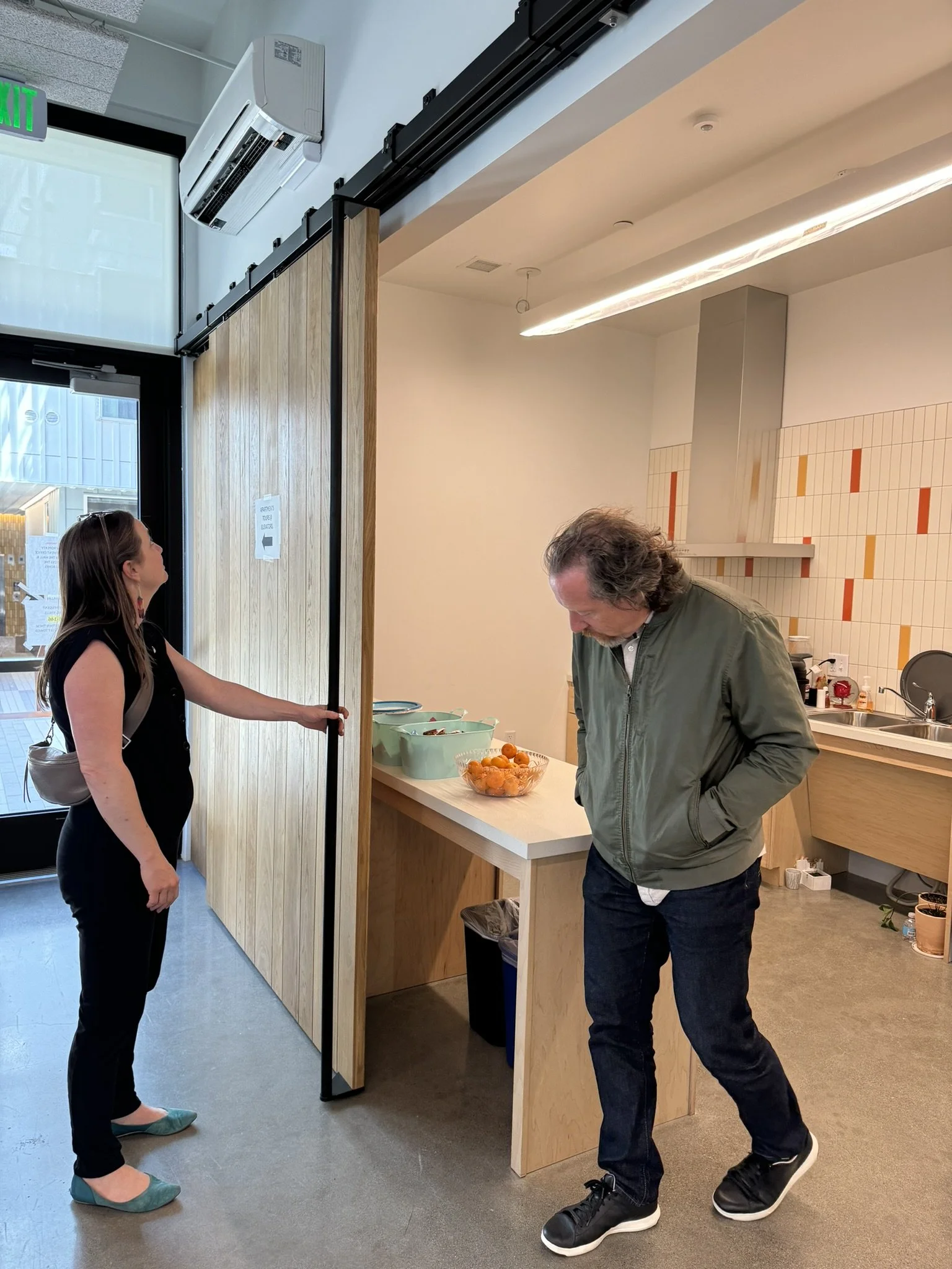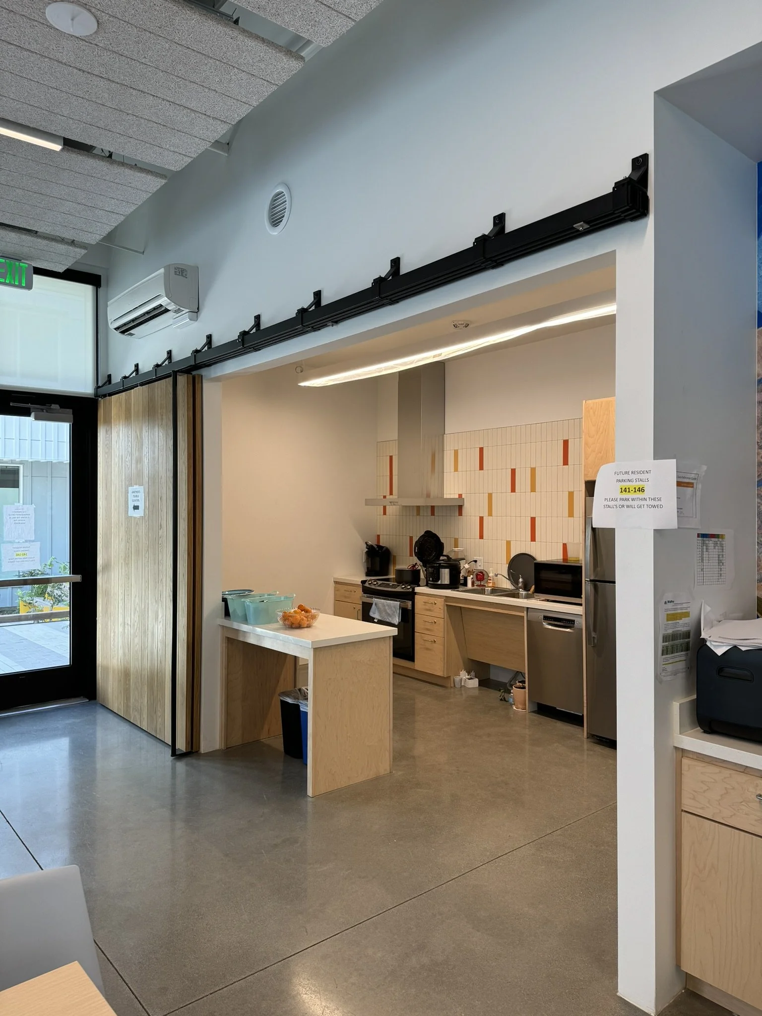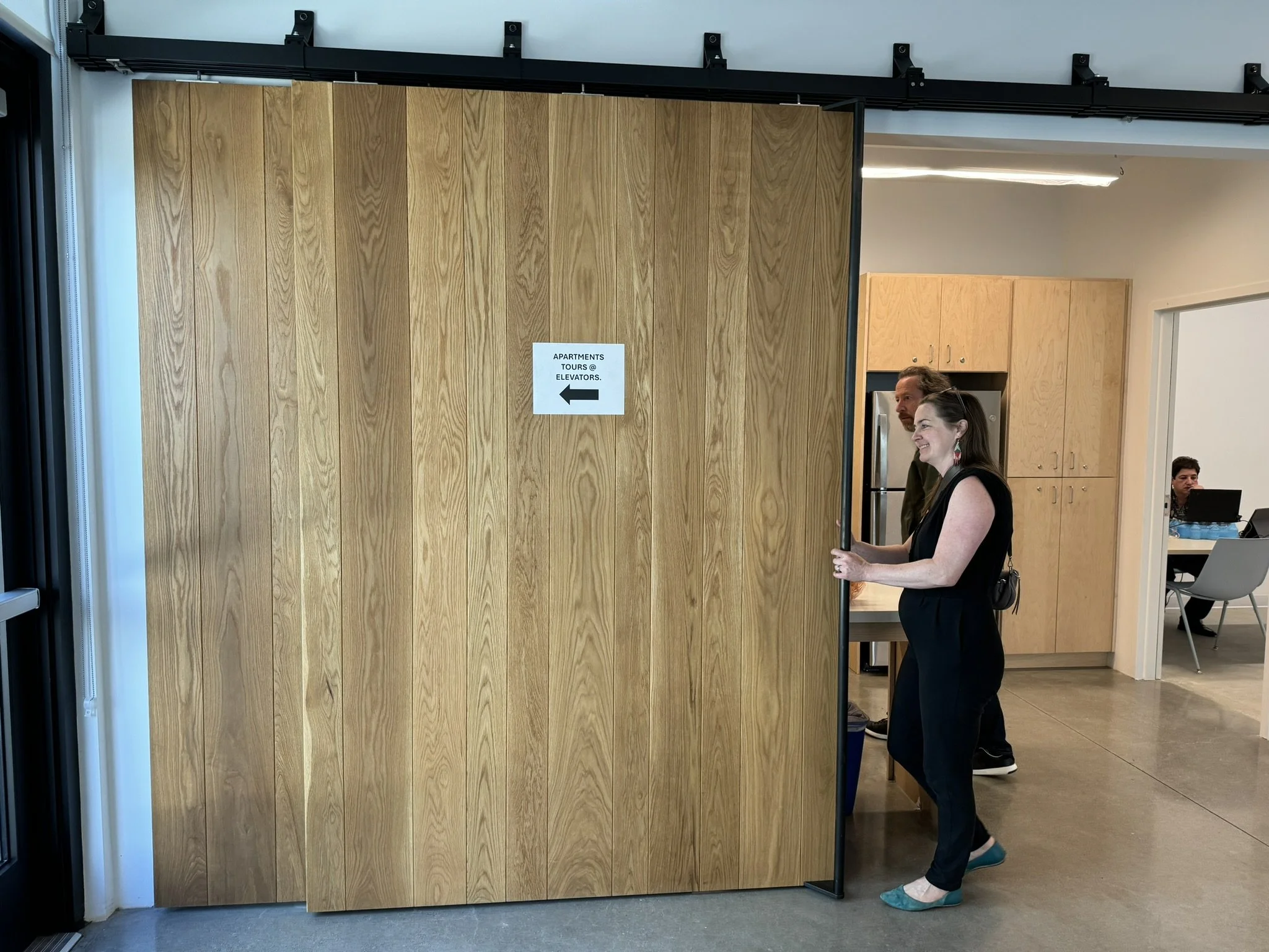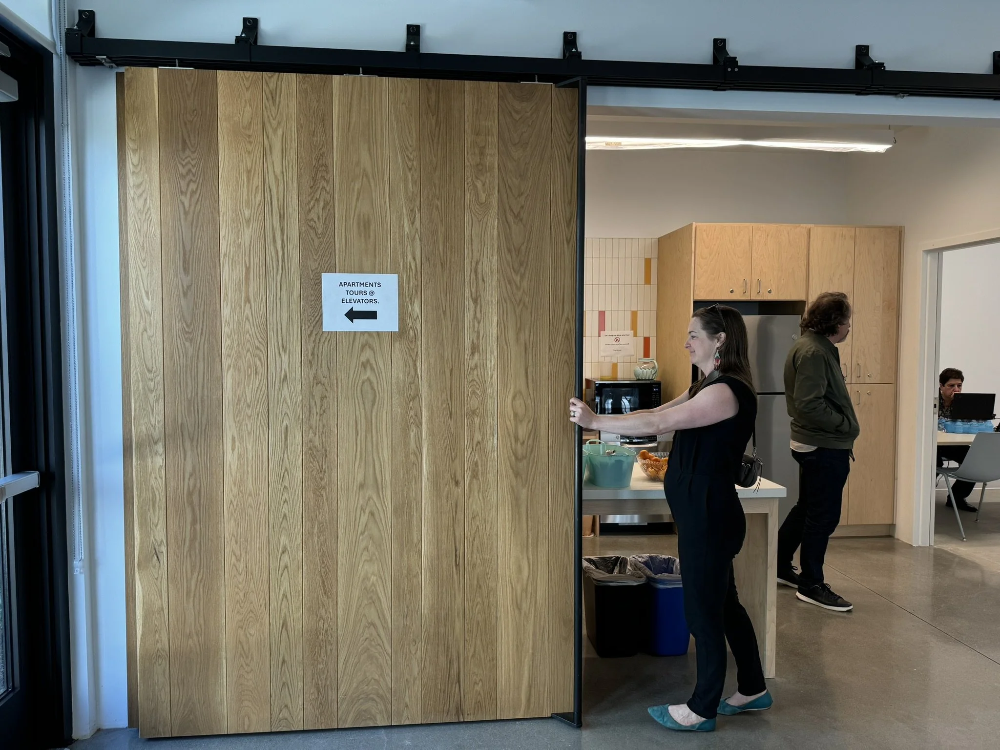 Community Room: A set of white oak sliding doors featuring shop sawn veneer and a custom full-height handle